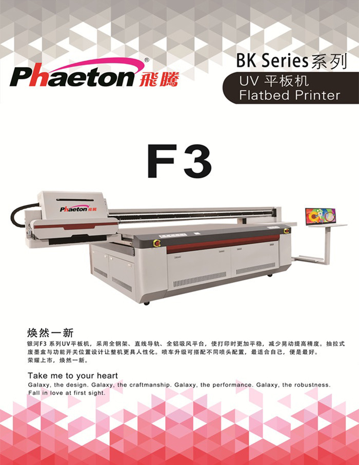 銀河F3系列UV平板機,采用全鋼架、直線導軌、全鋁吸風平臺,使打印時更加平穩,減少晃動提高精度。抽拉式廢墨盒與功能開關位置設計讓整機更具人性化。噴車升級可搭配不同噴頭配置,最適合自己,便是最好。 榮耀上市,煥然一新。